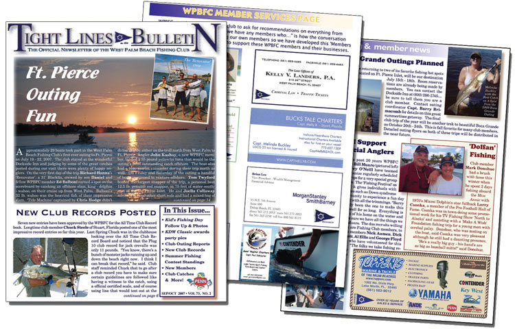 The WPBFC publishes a newsletter style magazine annually, which offers advertising opportunity. The award winning Tight Lines Bulletin is distributed by mail to over 1,800 fishing club members and affiliates. Hundreds of additional copies are distributed to local tackle shops, marine businesses and are included in informational packets direct mailed by the Fishing Club. A significant discount on business card sized ads in the ‘Member Services’ section of the bulletin is offered to all WPBFC members in good standing.