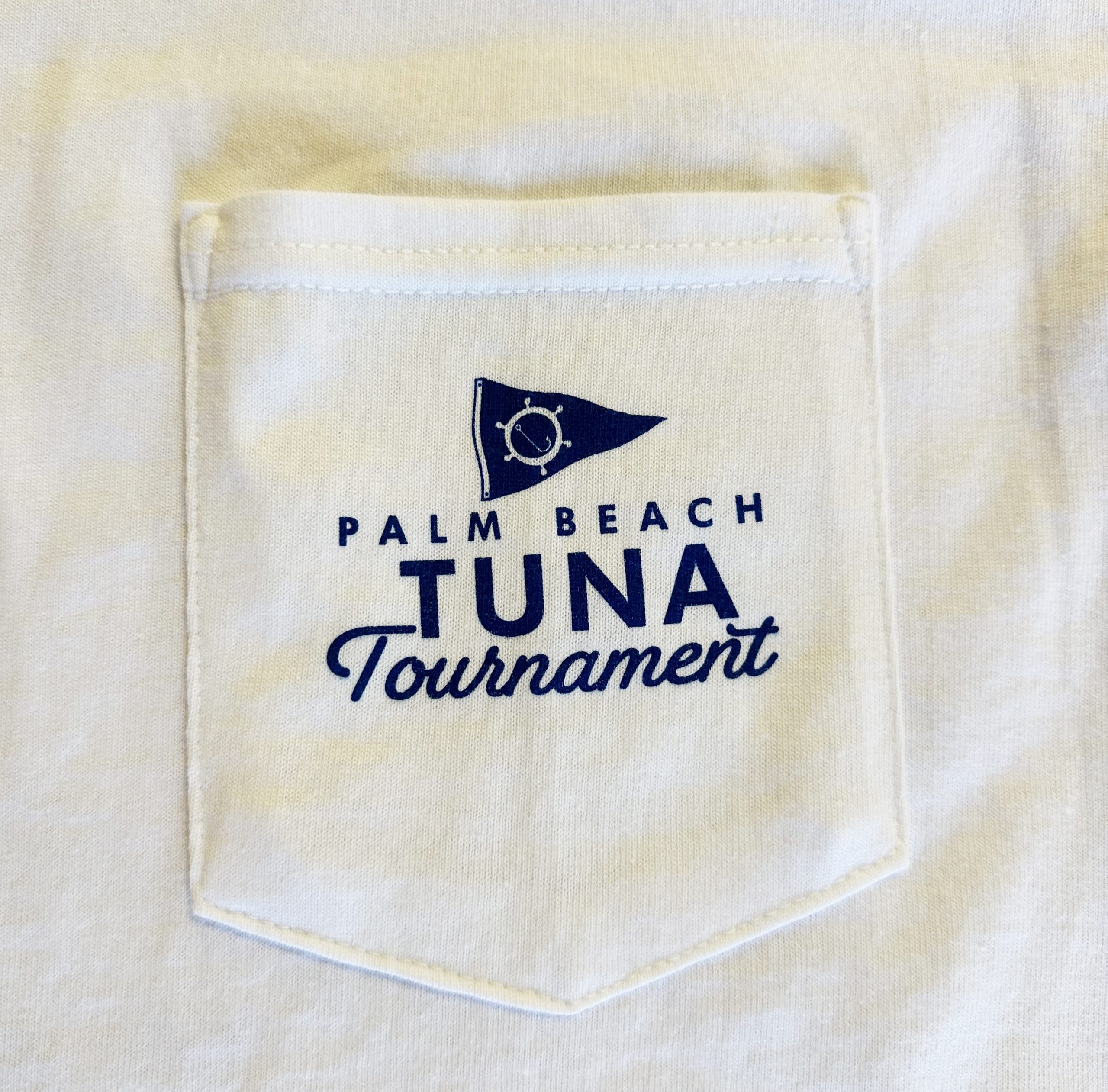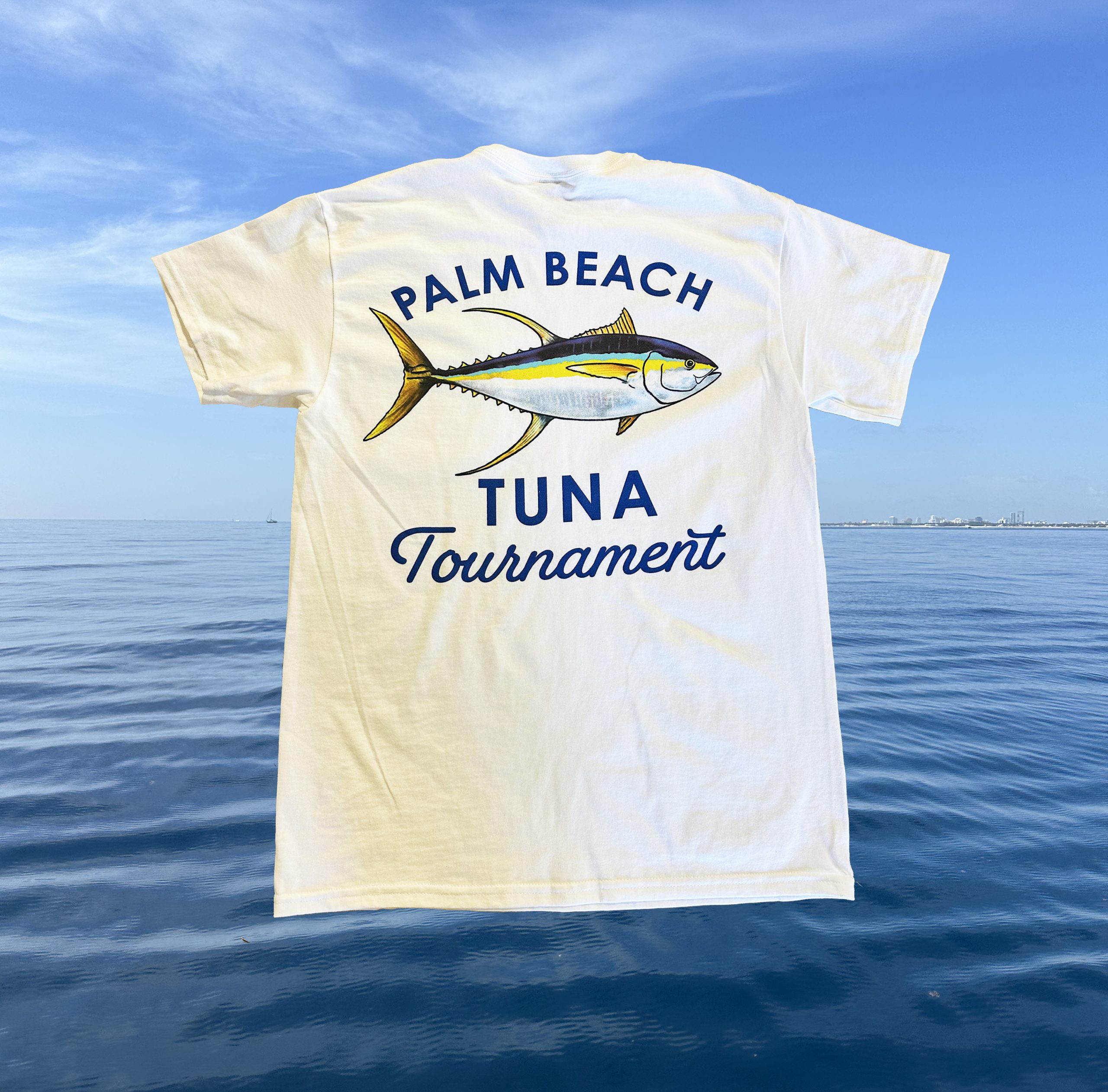 100% cotton, short sleeve, white shirt featuring a yellowfin tuna. Front chest has a pocket featuring a small club burgee & and tournament text.