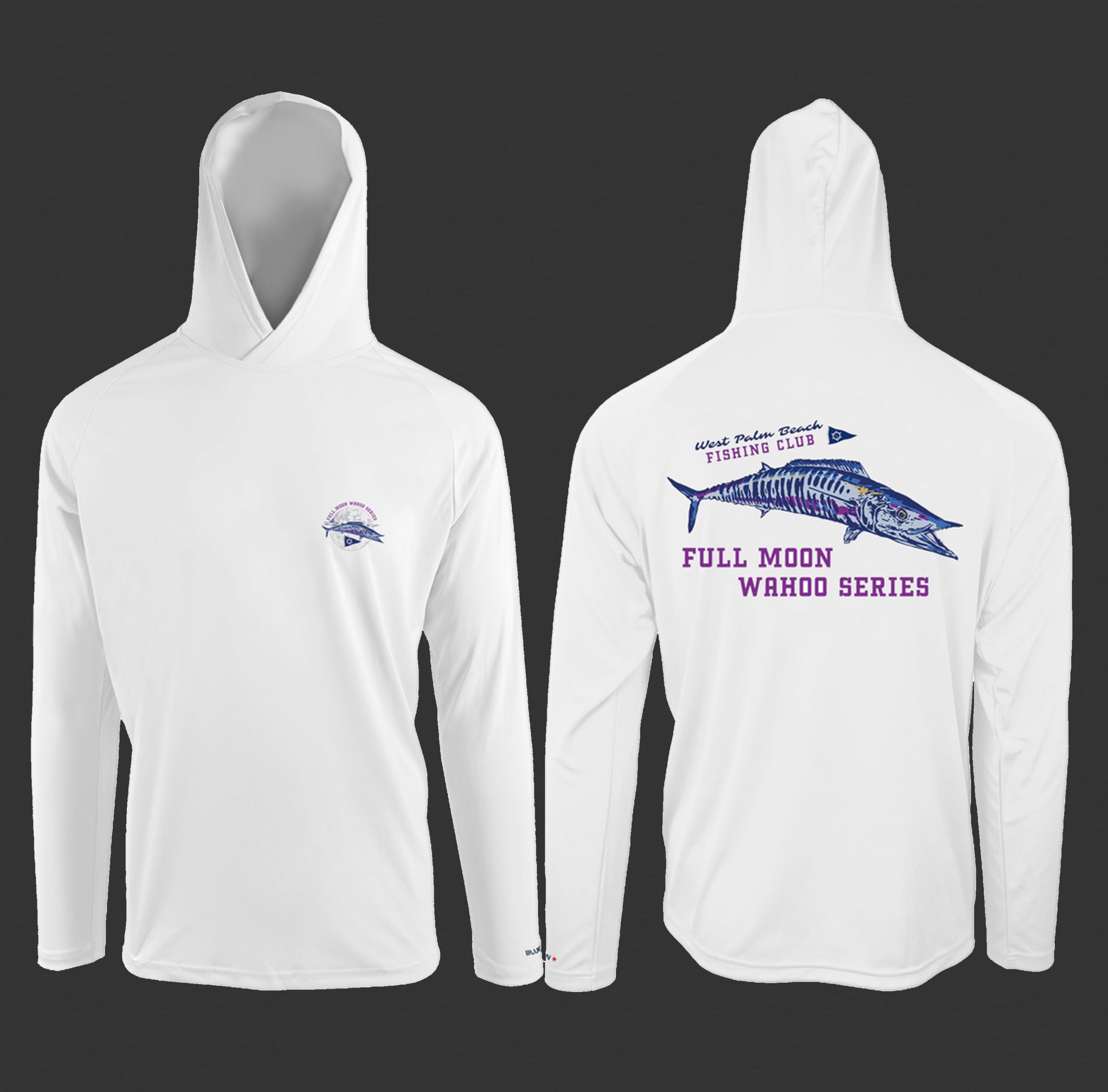Bluefin USA super lightweight advanced polyester construction, anti-microbial quick dry fabric, UPF 50+ sun protection hooded shirt featuring the 2024 Full Moon Wahoo Series design (no pocket).