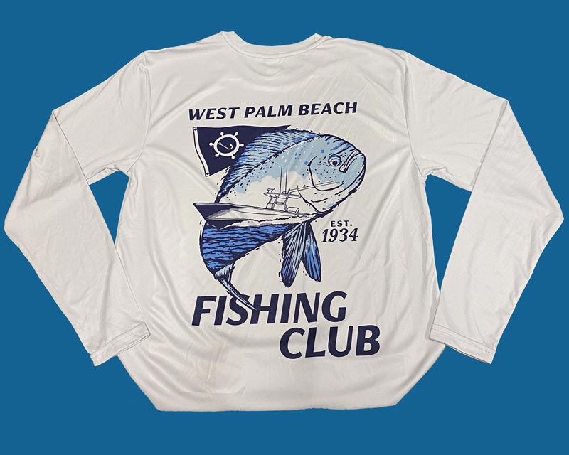 100% polyester, long sleeve, no pocket, light grey performance t-shirt featuring a unique mahi design on the back, and a small club burgee on the chest. Add $2.00 for 2XL and 3XL sizes.