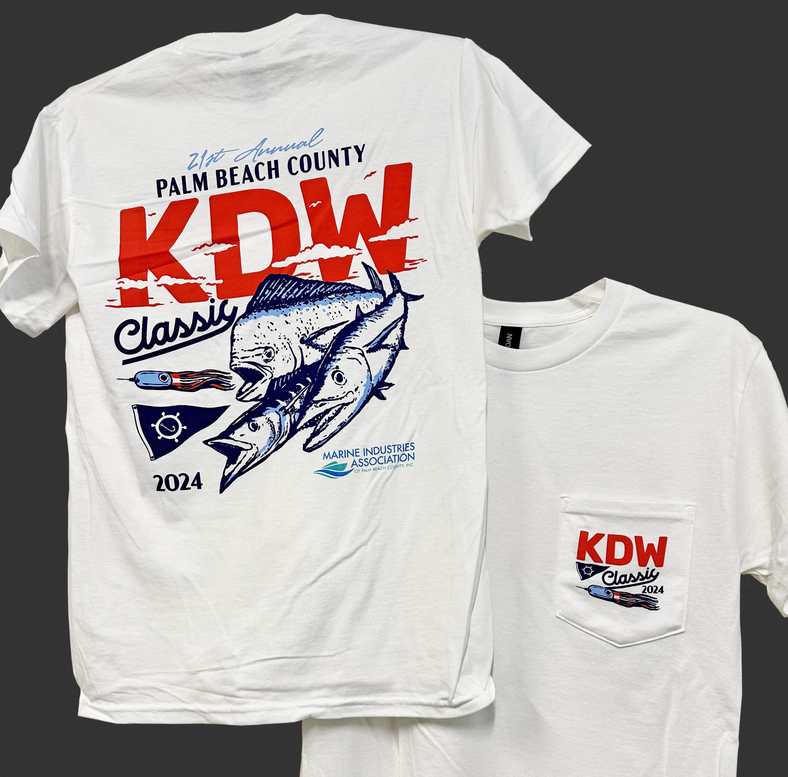 Cotton short sleeve pocketed tournament tee shirt from the club’s KDW Classic, featuring a red/white/blue themed kingfish, dolphin and wahoo design. Adult sizes only.