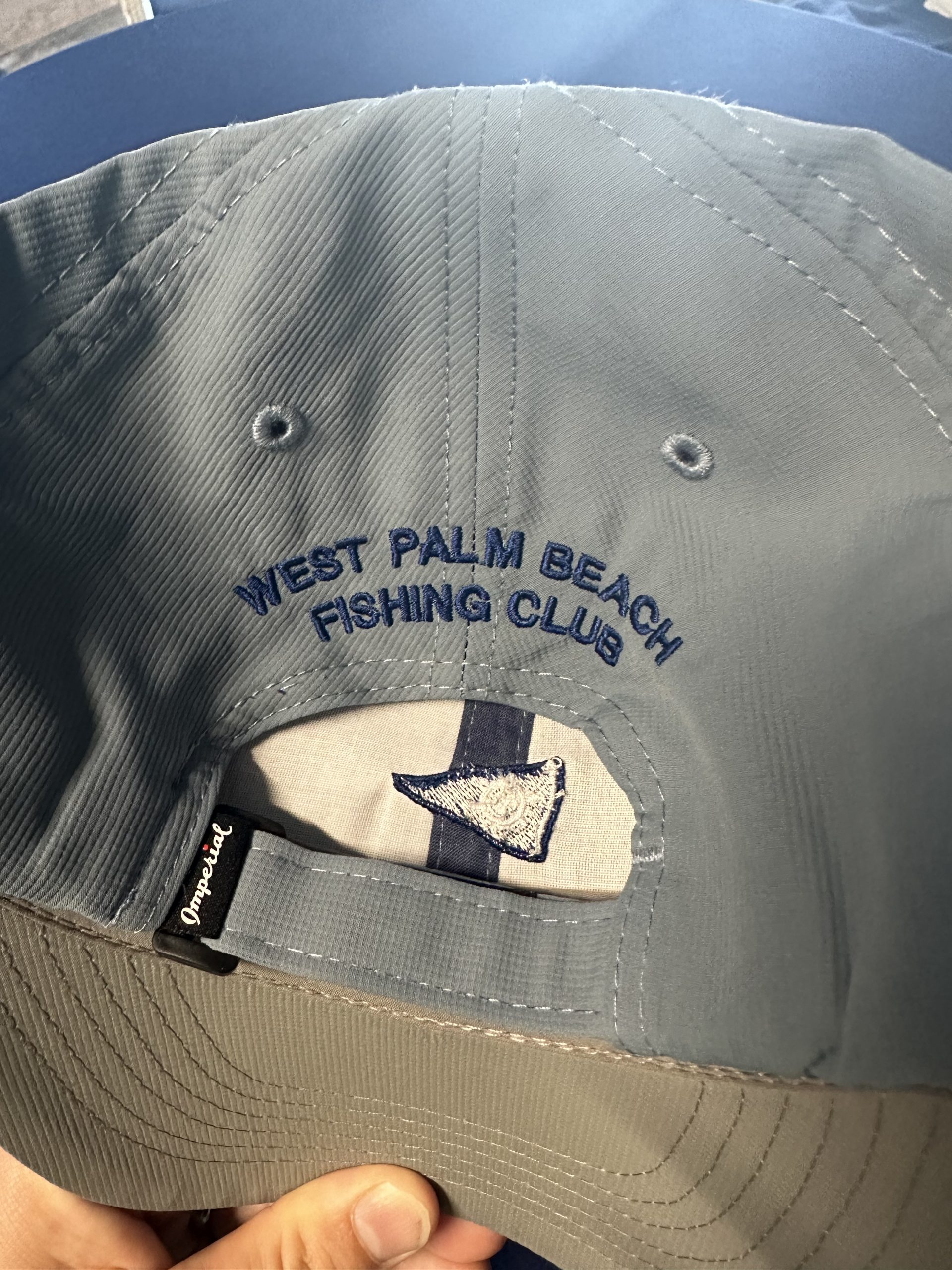 Lightweight, unstructured, adjustable Imperial performance hat, featuring club burgee (front), and West Palm Beach Fishing Club embroidery (back). Color: Breaker Blue