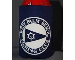 Navy neoprene can coolie with West Palm Beach Fishing Club logo.