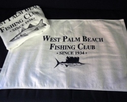 Cotton towel with West Palm Beach Fishing Club Since 1934 featuring a sailfish.